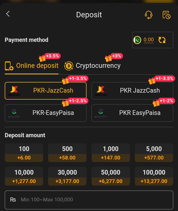 Players can deposit using JazzCash or Easypaisa instantly.